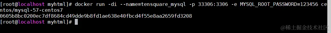 docker run -di --name=tensquare_mysql -p 33306:3306 -e MYSQL_ROOT_PASSWORD=123456 mysql