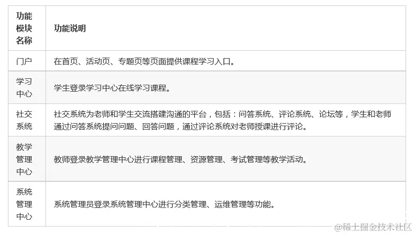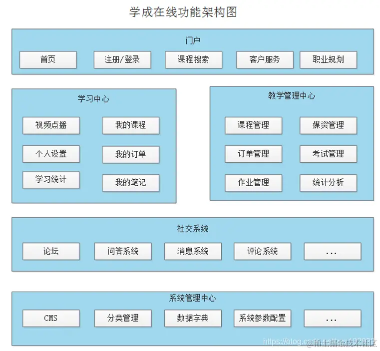 学成在线包括门户、学习中心、教学管理中、社交系统、系统管理等功能模块。