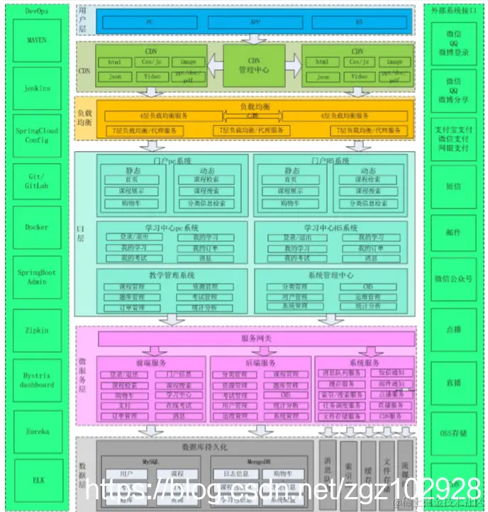 学成在线采用当前流行的前后端分离架构开发,由用户层、UI层、微服务层、数据层等部分组成,为PC、App、 H5等客户端用户提供服务。下图是系统的技术架构图: