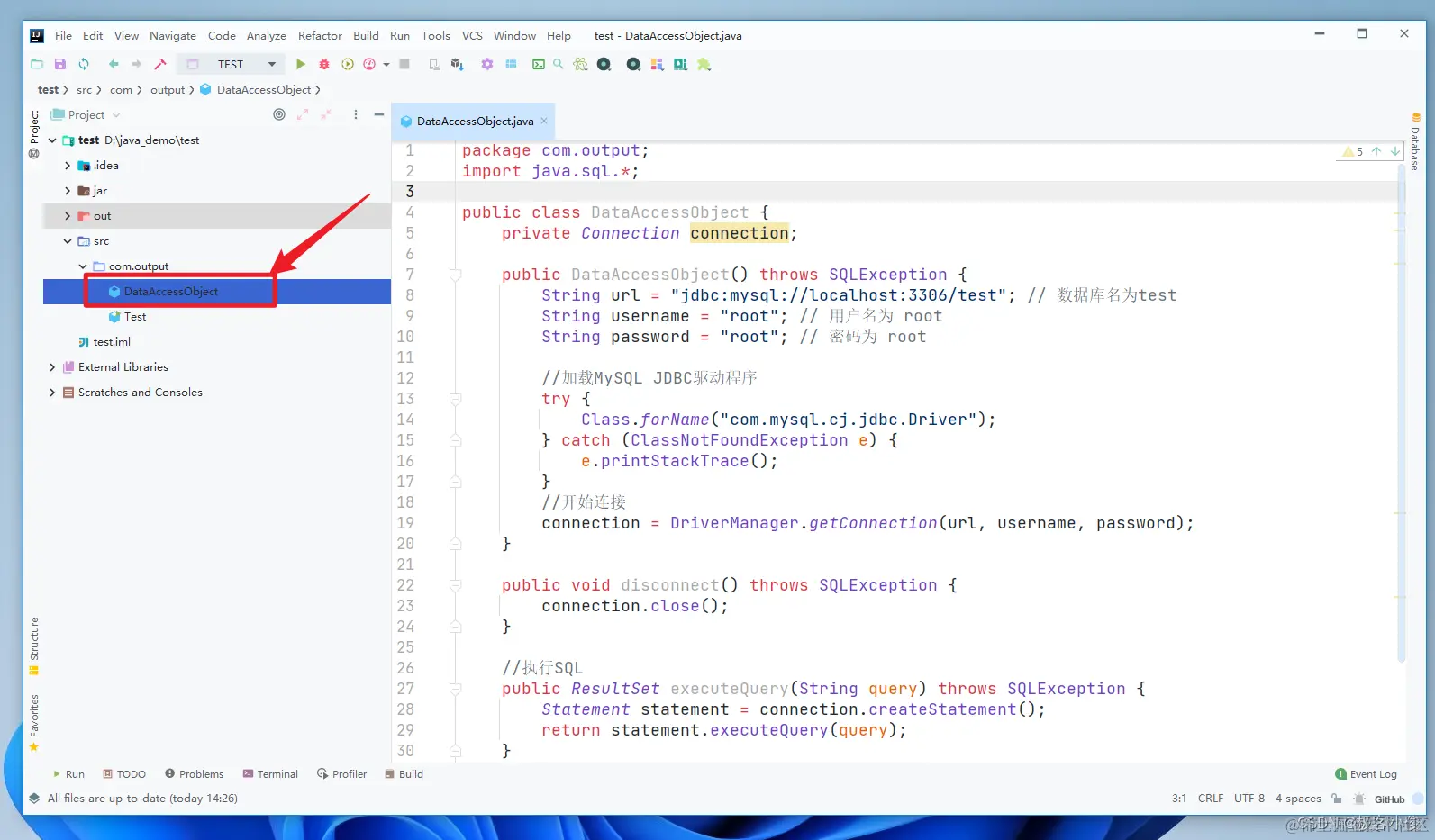 这里我就在com.output包中新建一个名为DataAccessObject类