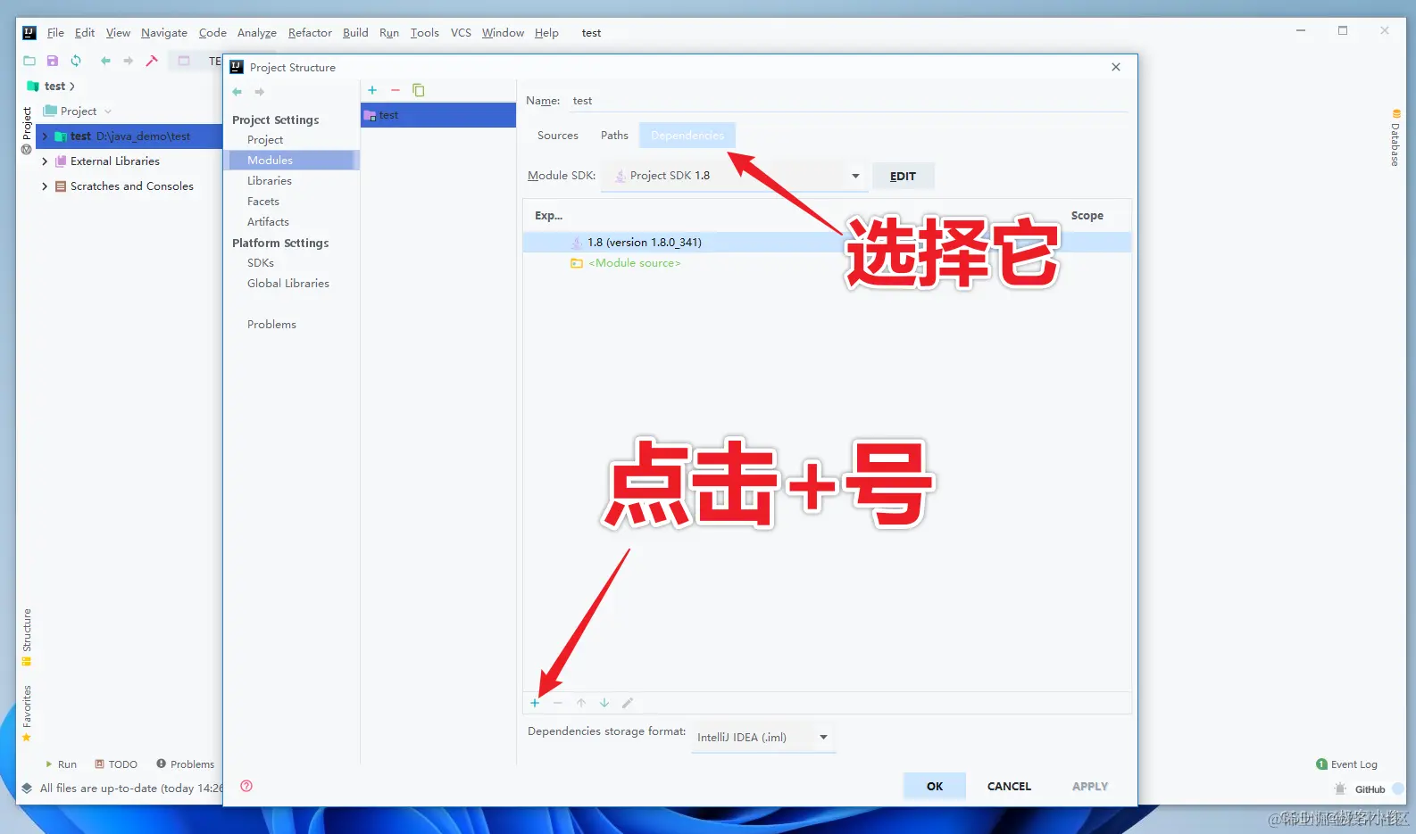 然后我们点击选择Dependencies(依赖项),然后点击下面的+号