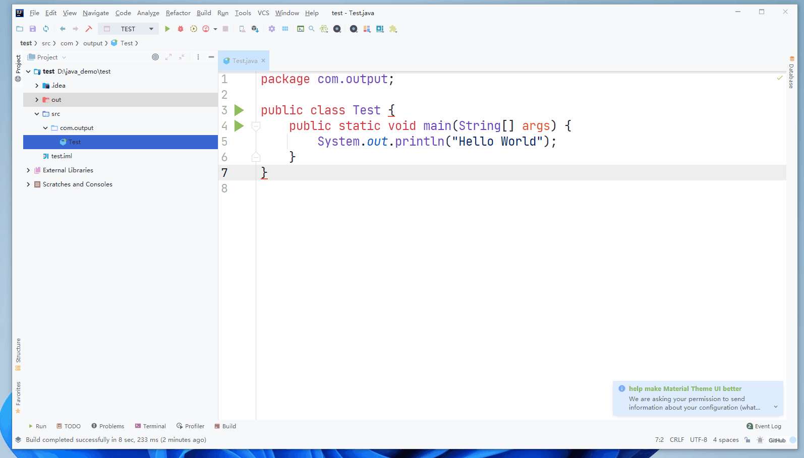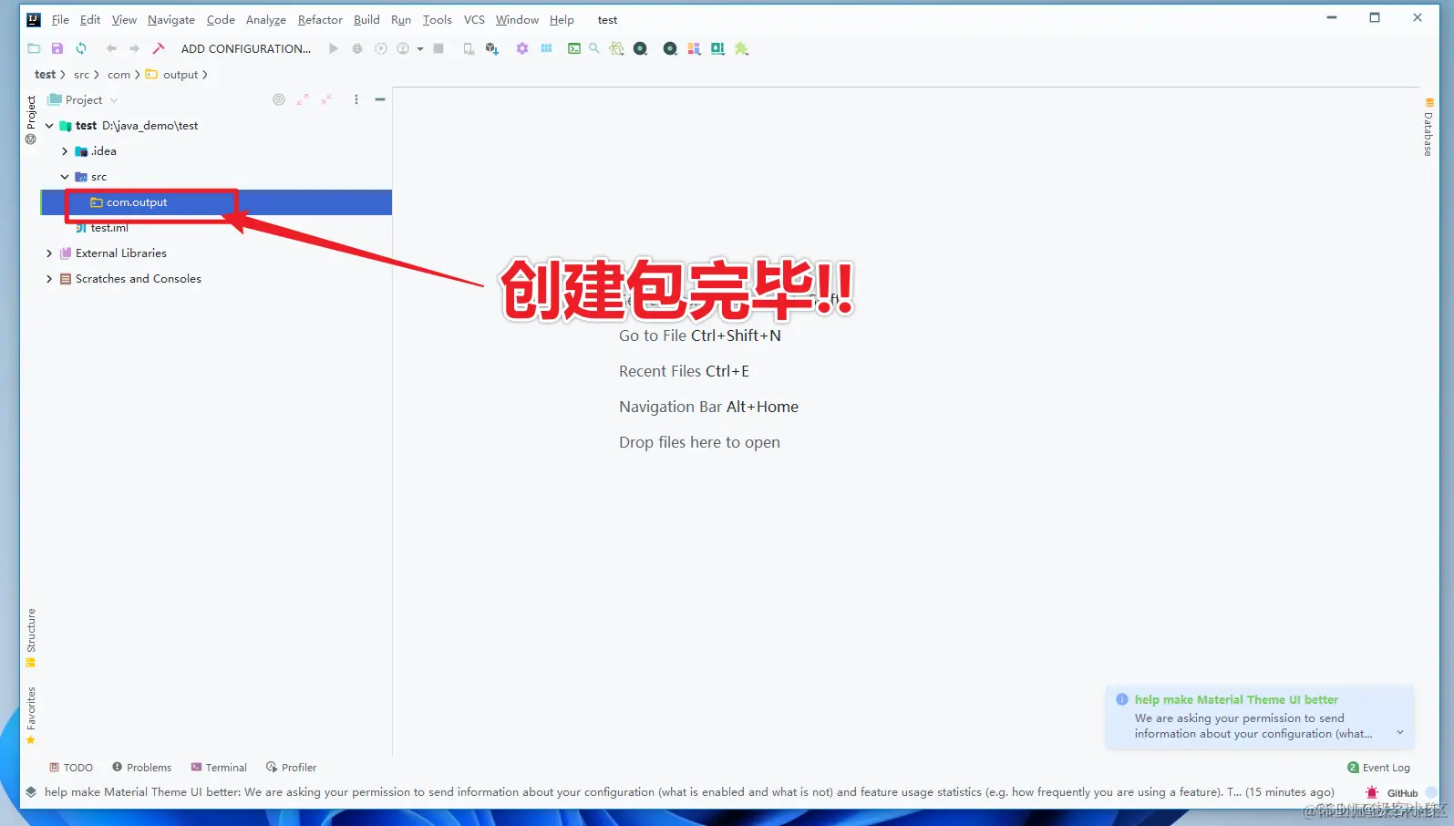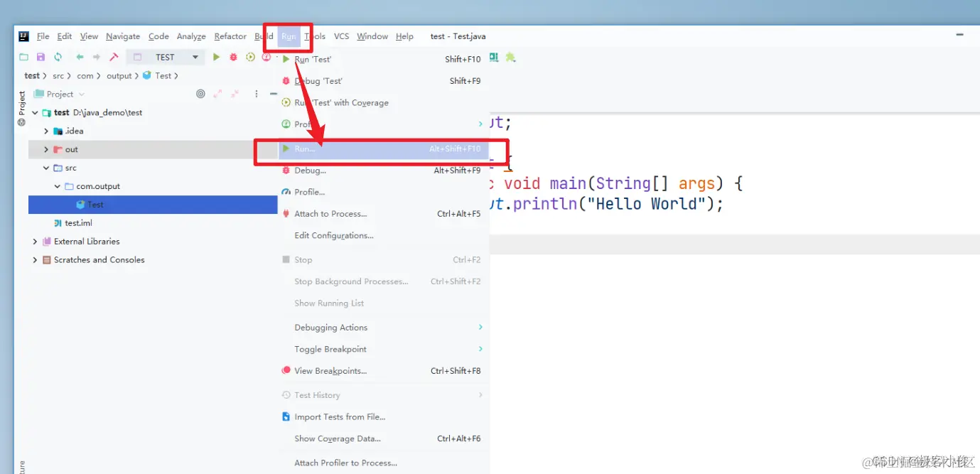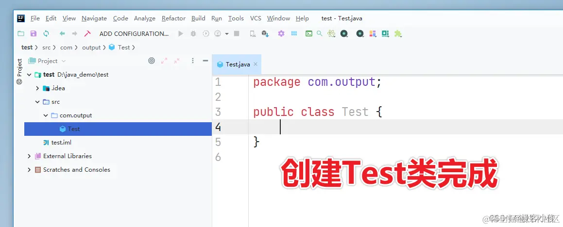 那么接着我们就在com.output包下面创建一个Test类来输出一个Hello world