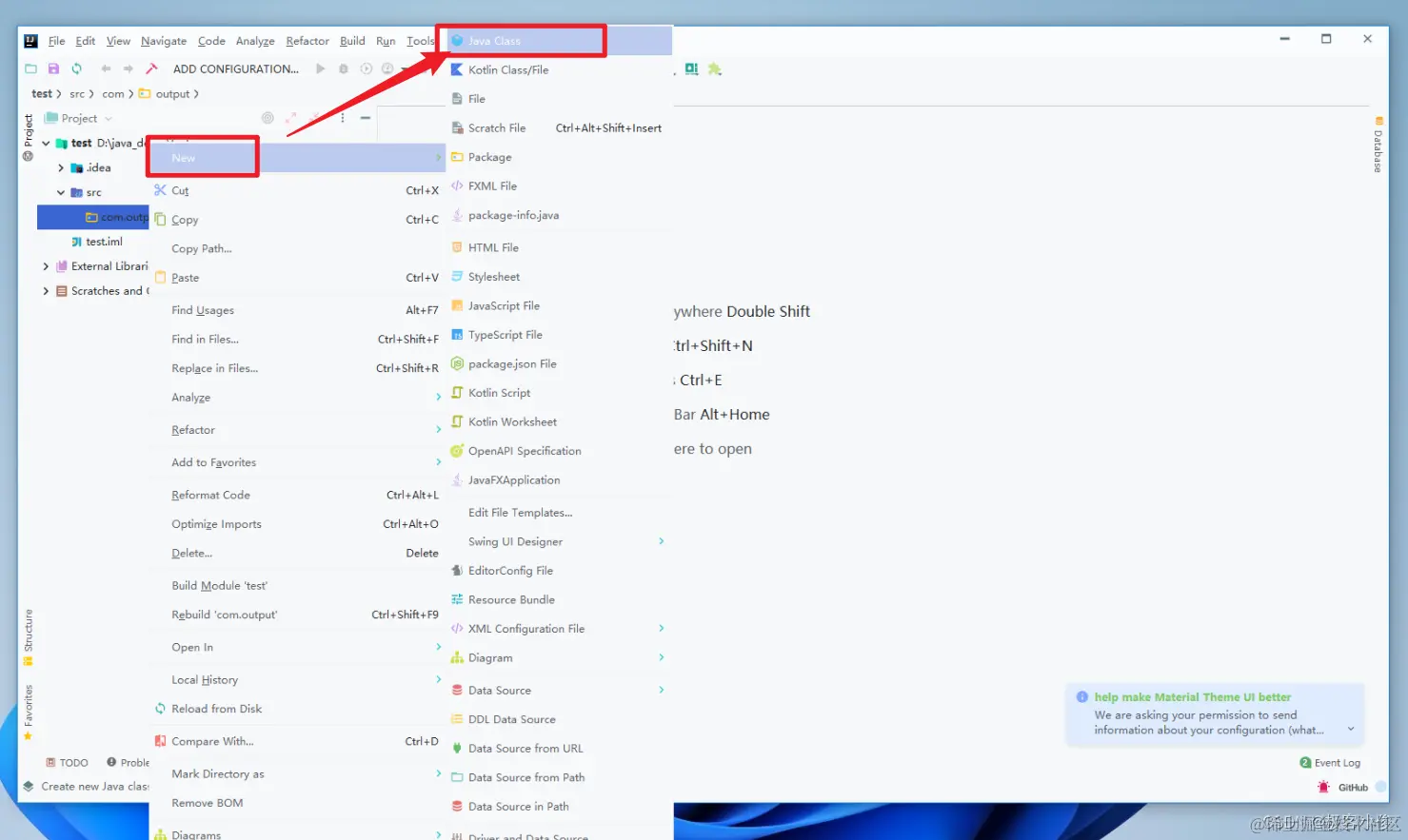 在com.output上右键选择new--->Java Class