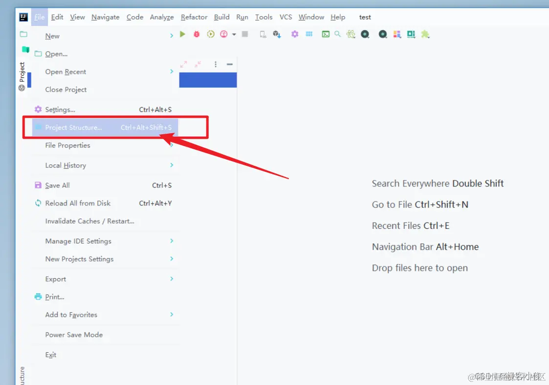 选择菜单栏file-->Project Stucture 或者按下键盘上的快捷键:ctrl+alt+shift+s