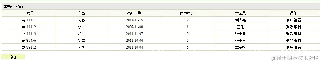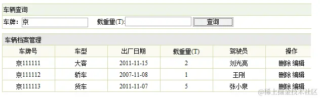 描述:管理员点击左侧的菜单“车辆信息管理”,页面跳转到车辆信息管理界面,调用后台的action类查询出所有的车辆信息,并把这些信息封转到数据集合List中,绑定到request对象,然后页面跳转到相应的jsp,显示出车辆信息。