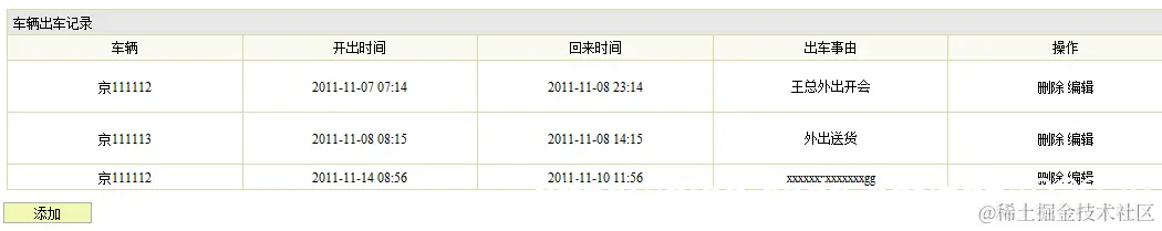 1.描述:管理员点击左侧的菜单“出车信息管理”,页面跳转到出车信息管理界面,调用后台的action类查询出所有的出车信息,并把这些信息封转到数据集合List中,绑定到request对象,然后页面跳转到相应的jsp,显示出出车信息。