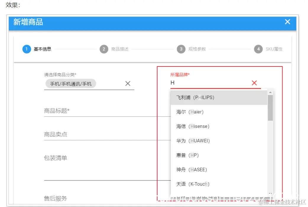 品牌也是一个下拉选框,不过其选项是不确定的,只有当用户选择了商品分类,才会把这个分类下的所有品牌展示出来。