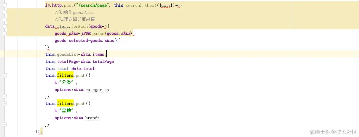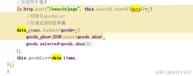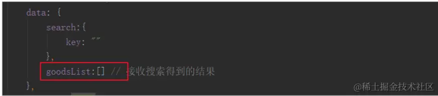 首先,在data中定义属性,保存搜索的结果: 这个事定义了一个goodsList的一个集合,这个集合里面就用来存放后端响应的所有的数据