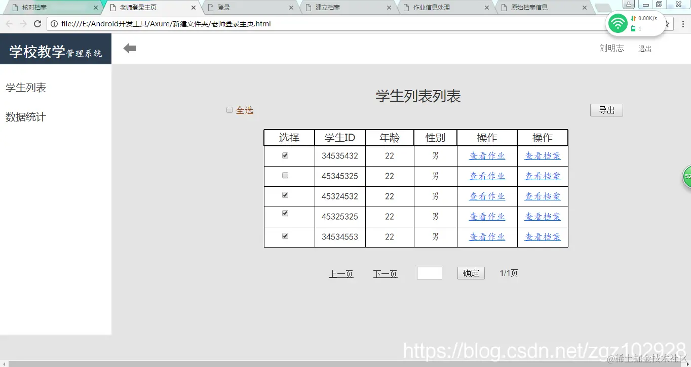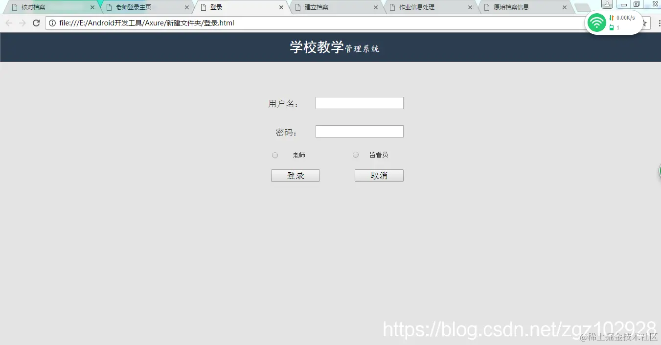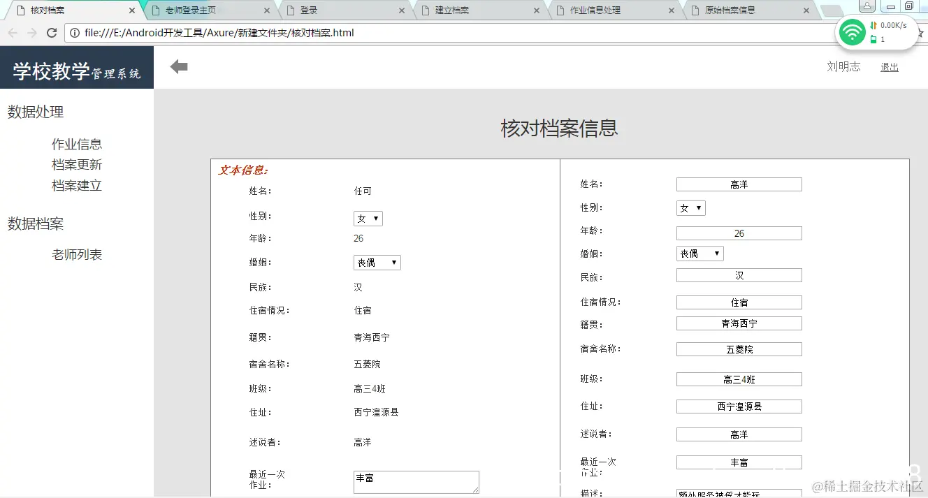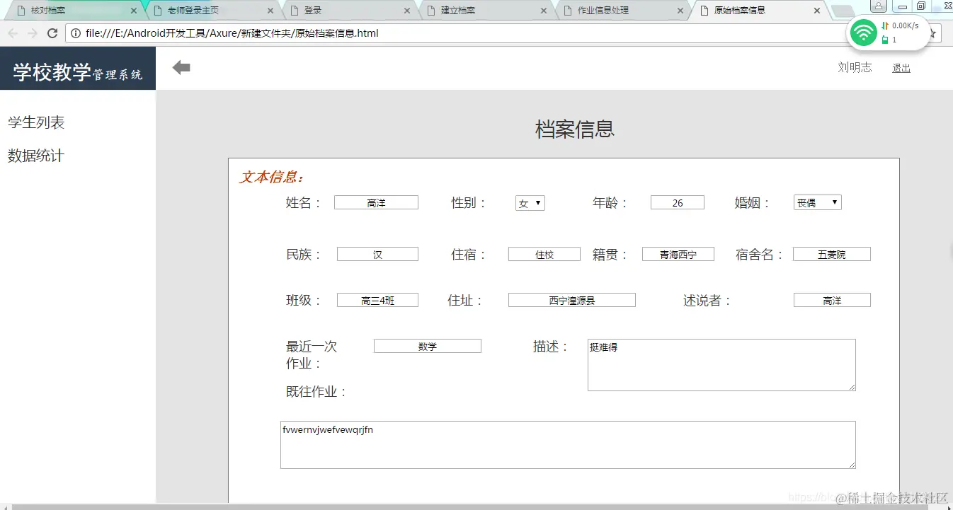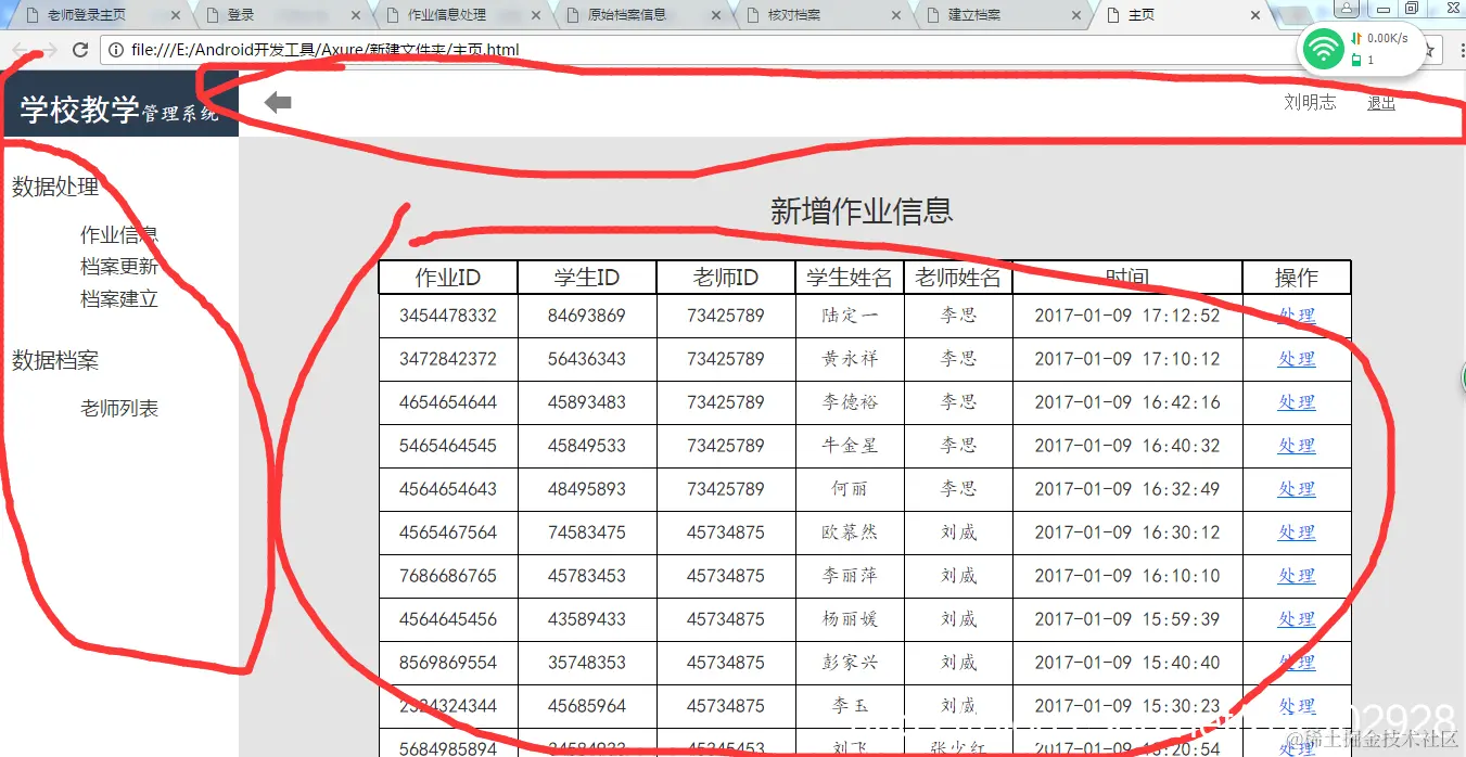 需要做的界面是原始档案信息,作业信息处理,老师登陆主页,建立档案,核对档案,登录,这六个页面。在新建文件夹里有这六个界面的html界面,也是需要最终做出的结果,可以在浏览器中浏览。截图如下: