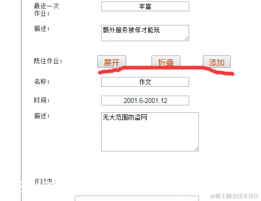 有展开,折叠,添加三个按钮。点击添加可以出现新的文本框填写新一条作业相关内容,并列表展示。点击折叠则隐藏作业展示列表。点击展开则展开。剩下两个界面皆是如此。要能动态实现。