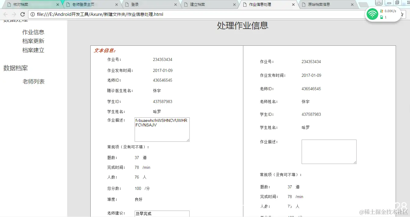 - 作业信息处理和建立档案页面左右两部分中,左侧是展示内容,内容从数据库读取,右侧需人工输入文本框,进入页面后,右侧部分文本框不显示内容,供人工输入信息。