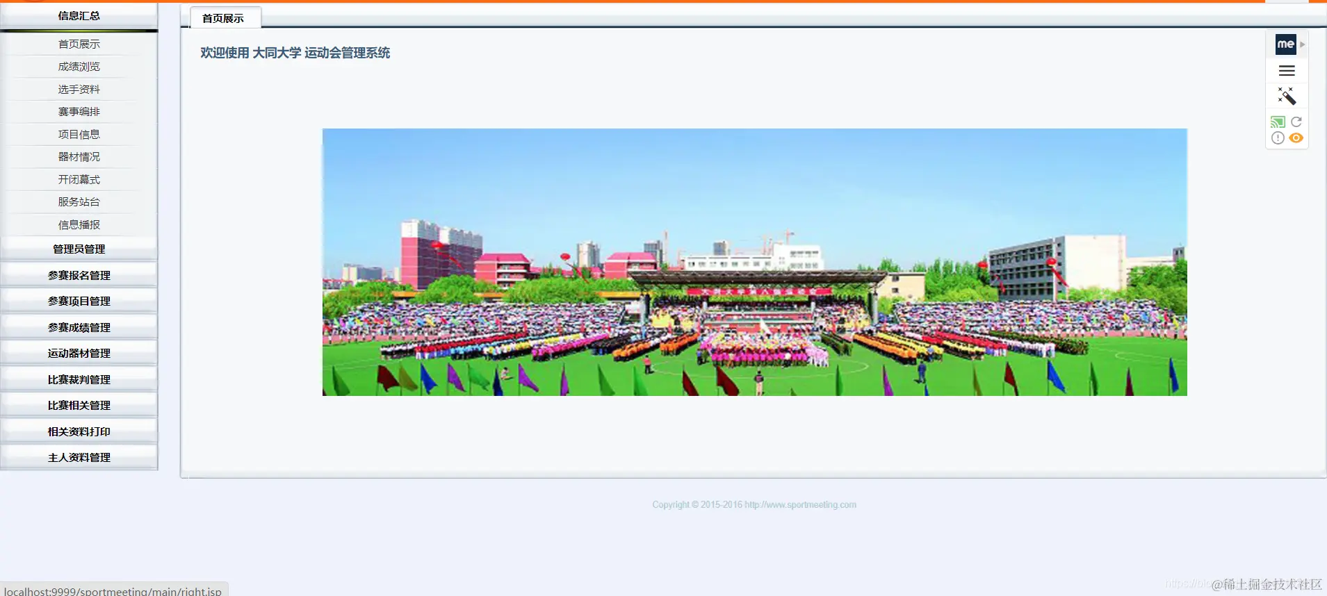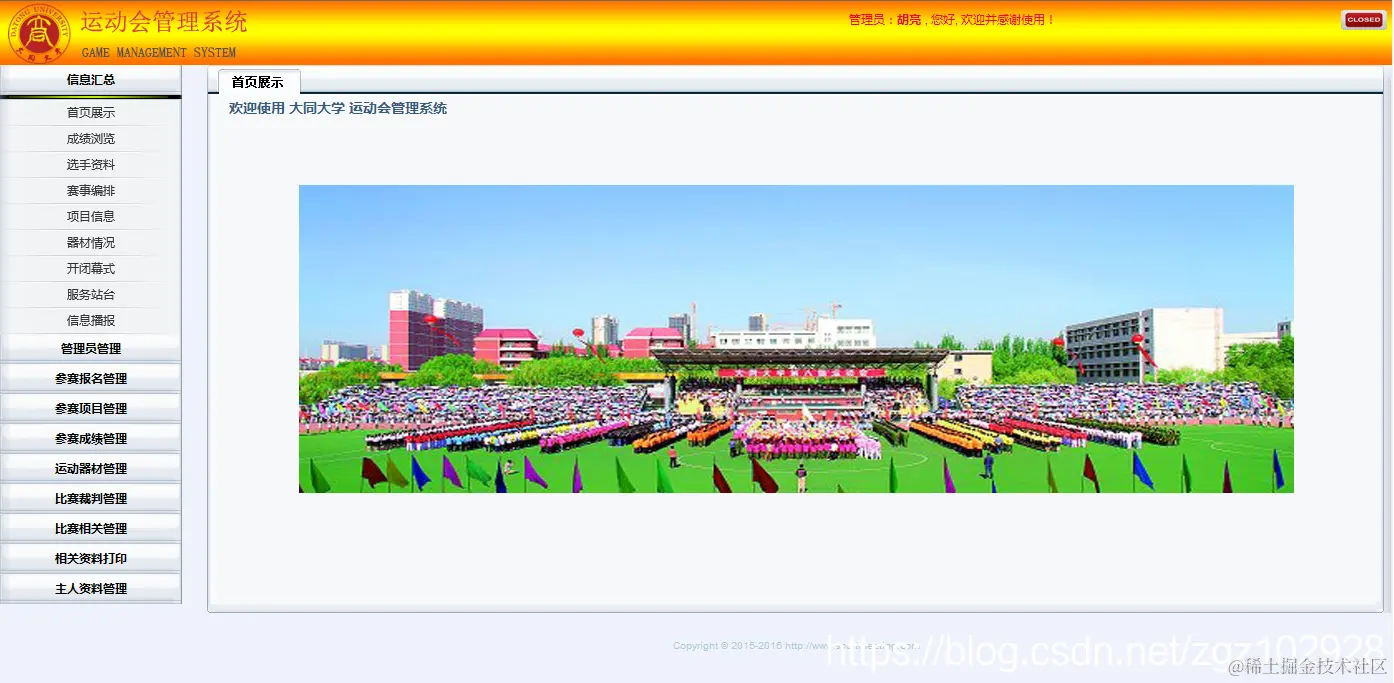 摘 ****要 : 科学技术的不断发展促进了高校信息化校园建设逐渐成形。管理高校运动会中的各种信息是一项繁琐而又复杂的工作,使用计算机对运动会各项信息进行管理,能够确保运动会参赛人员、成绩等各项数据准确、快速地输出。大同大学运动会管理系统是采用Java编程语言开发的基于SSH框架的管理系统。该系统选用MySQL5.6作为数据库,选用MyEclipse8.5作为开发工具,实现了信息汇总及对管理员、参赛报名、参赛项目、参赛成绩、运动器材、比赛裁判等的管理和相关资料的打印。该系统的实现,一方面可减少学校对运动会管理的人力、物力投入,另一方面还可以提高运动会管理者的工作效率。经实践证明,该系统具有一定的实际使用价值。
