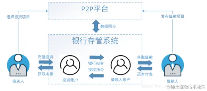 3.1 需求分析 开户是指借款用户和投资用户在注册后、交易前都需要在银行存管系统开通个人存管账户,在开户流程 中银行存管系统是一个很重要的系统,它是当前P2P平台最常见的一种模式,为了保证资金不流向P2P 平台,由银行存管系统去管理借款用户和投资用户的资金,P2P平台与银行存管系统进行接口交互为借 款用户和投资用户搭建交易的桥梁,它们之间的关系如下: