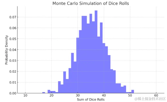 这段代码实现了1000次蒙特卡罗模拟,模拟的内容是每次连续掷骰子10次。接着,我们根据这些模拟结果来绘制骰子投掷总和的分布直方图。直方图展示了在每次模拟中,10次掷骰子得到的各种可能总和的概率密度。通过这样的可视化方式,我们可以更直观地理解当多个骰子被多次掷出时,最终结果分布的情况。