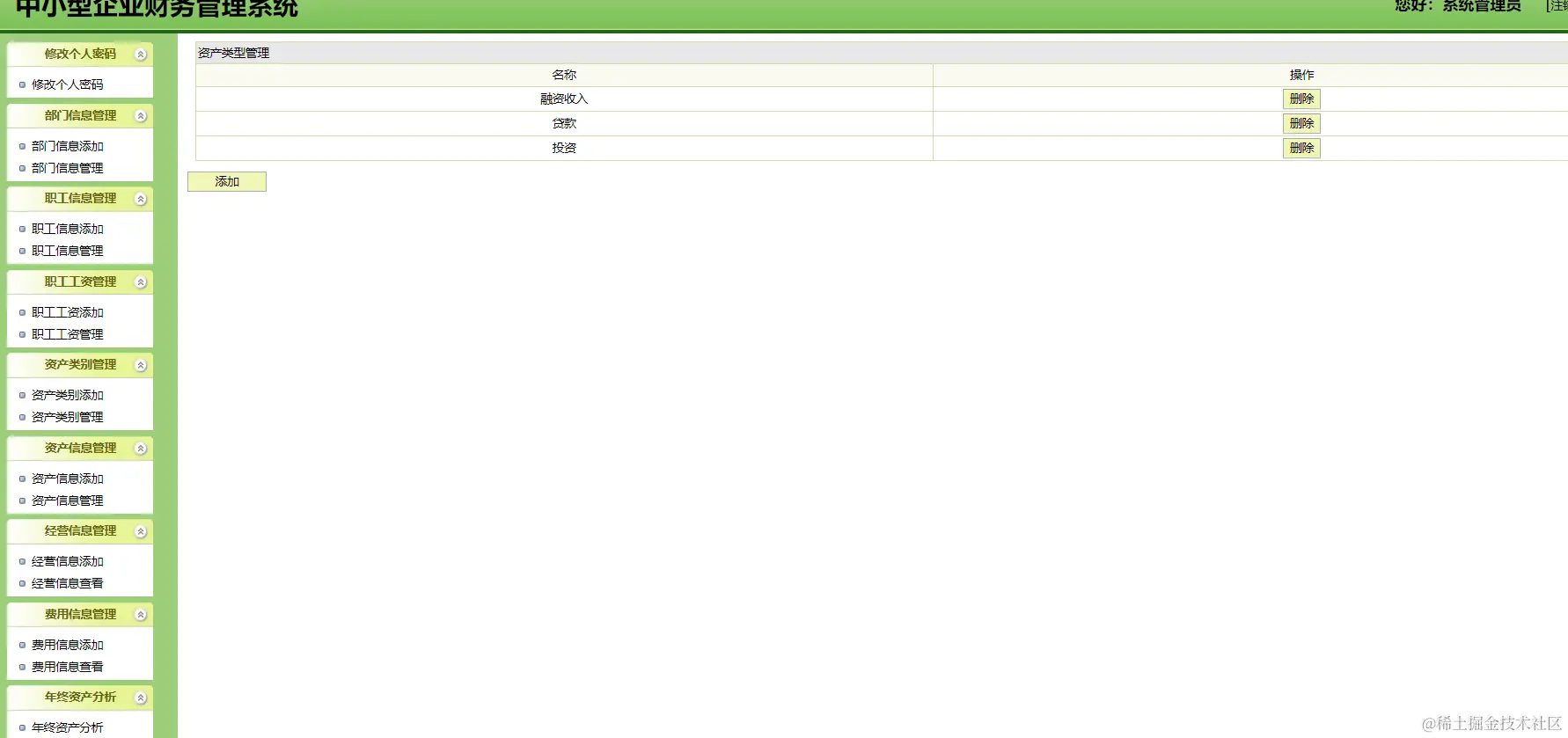 资产类别管理模块:实现资产类别的增加、删除、查看功能;