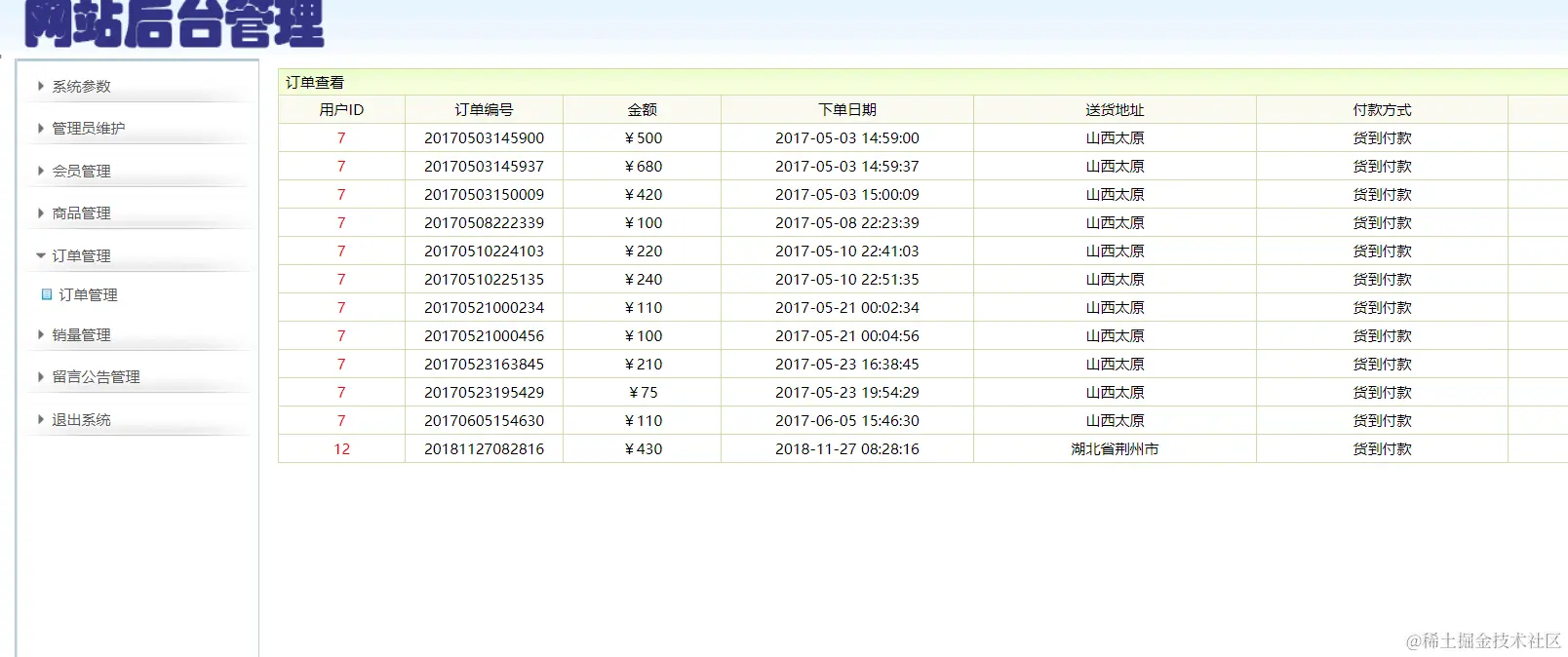 订单管理:显示所有订单,查询订单明细,受理、删除订单