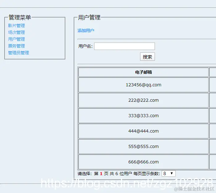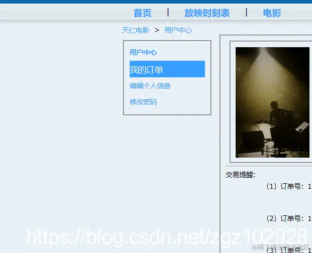 - 我的订单:显示我的电影订单,并可对可退票的订单进行退票操作;退票成功后,系统自动发送用户退票信息到用户邮箱