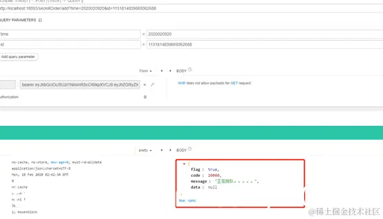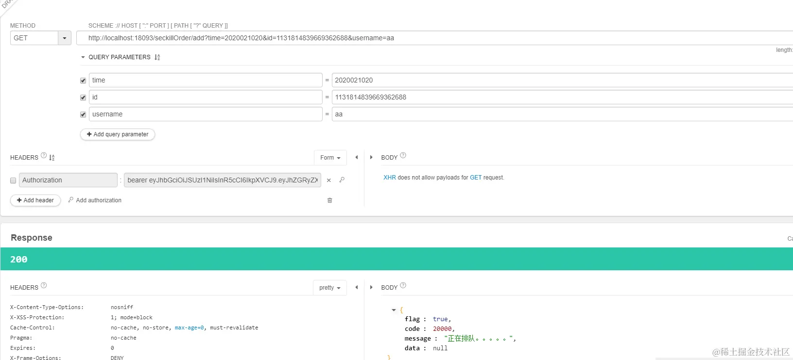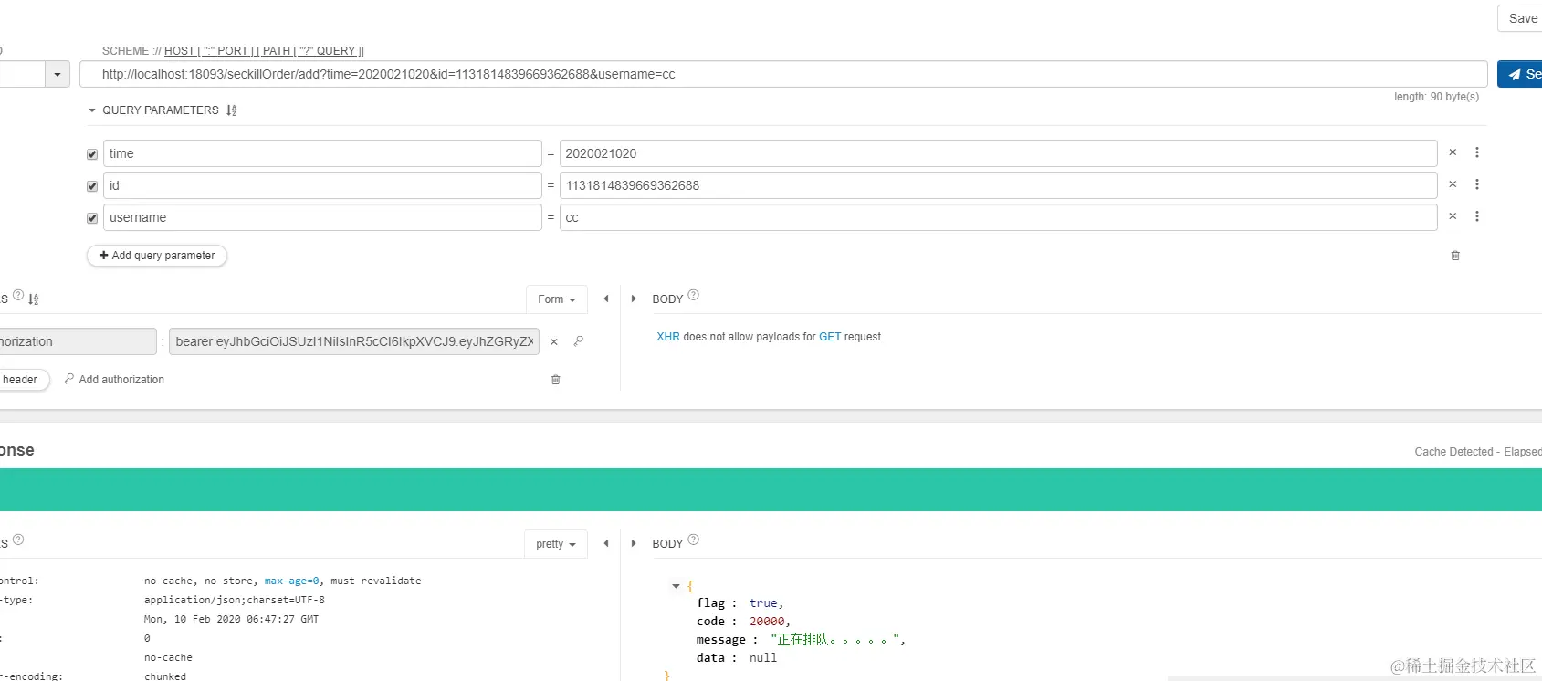 发起请求:http://localhost:18093/seckillOrder/add?time=2020021020&id=1131814839631613952&username=szitheima