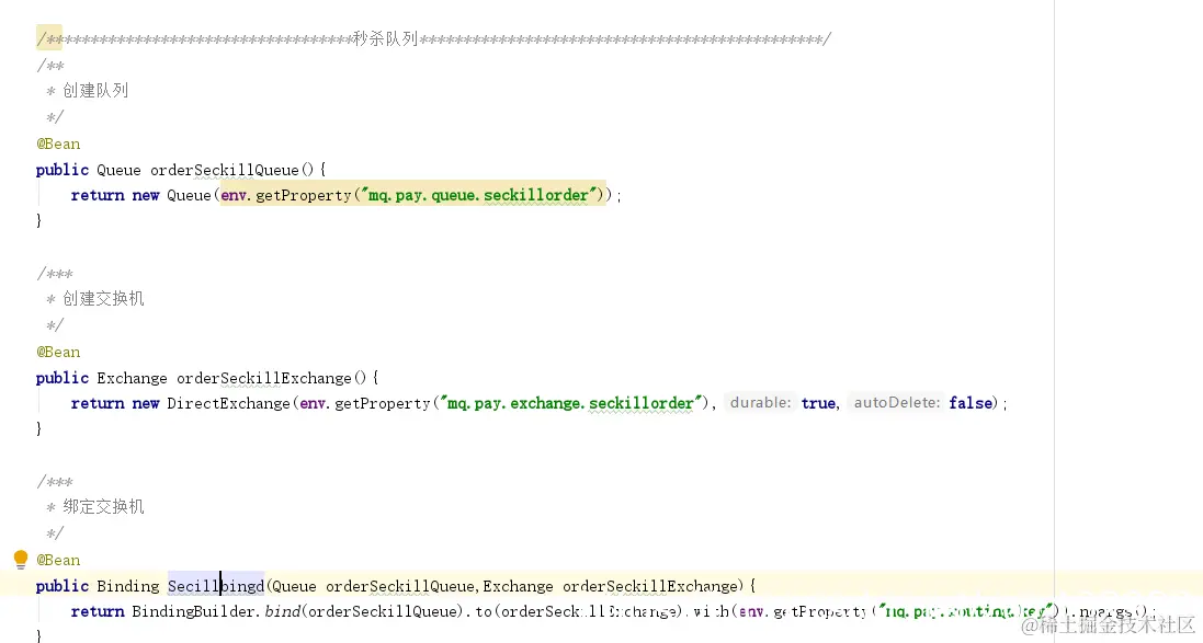 public Binding exchangetoqueue(Queue orderSeckillListenerQueue ,Exchange orderSeckillListenerExchange ){