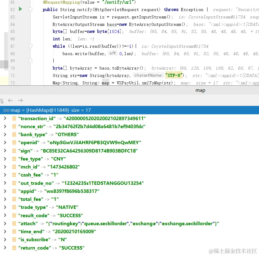 这个RabbitMq捕捉腾讯响应过来得得消息速度很慢,如果想让MQ能及时得抓到腾讯服务器响应过来得支付成功得信息,建议在发送得时候打个断点,这样就可以给MQ捕捉到腾讯服务器响应数据得时间,不然响应时间太快,MQ来不及更新,数据及时得响应并且接口对调成