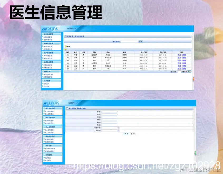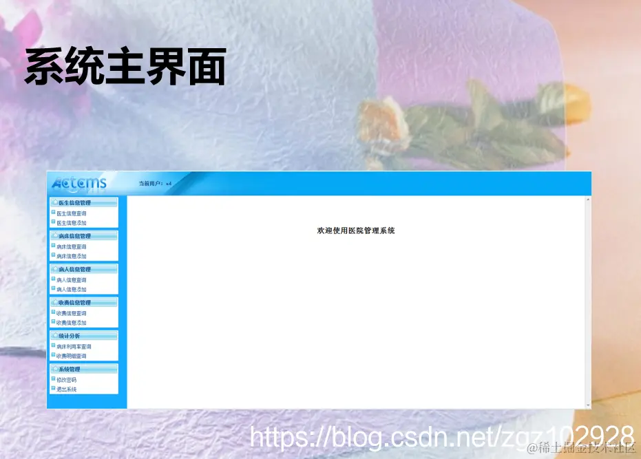 本系统主要分为六大模块,分别是医生管理模块、病人管理模块、病床管理模块、收费管理模块、统计分析模块和系统功能模块 ,医生、病人和医院的管理人员都可以通过此系统寻找出自己所需要的信息。