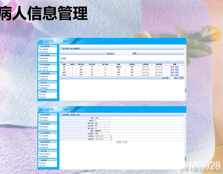 • 医院管理住院系统是一项集多类学科为一体的系统,其中包含医学、信息、计算机等学科,广泛的应用在当今欧美等发达国家,给治疗患者们提供了很大的便利。假如全面实现了这一系统,能够极大限度的改进医院的治疗水平,在患者面前重新建立起医院的良好形象。