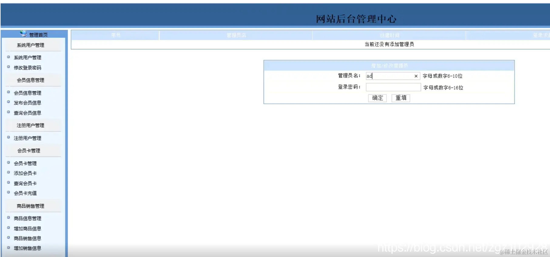 系统用户管理模块:实现管理员的增加、查看功能;