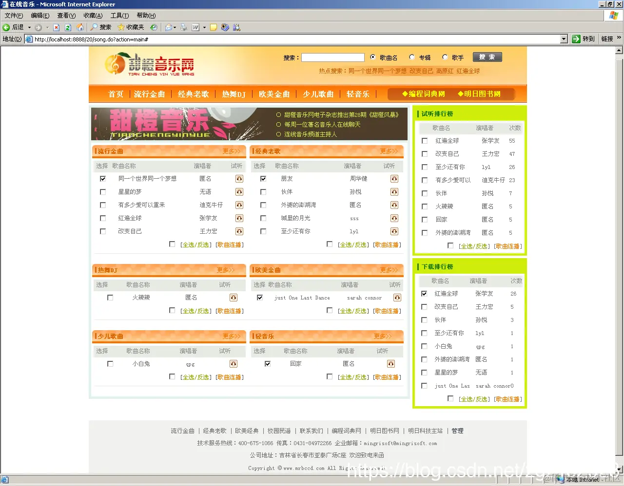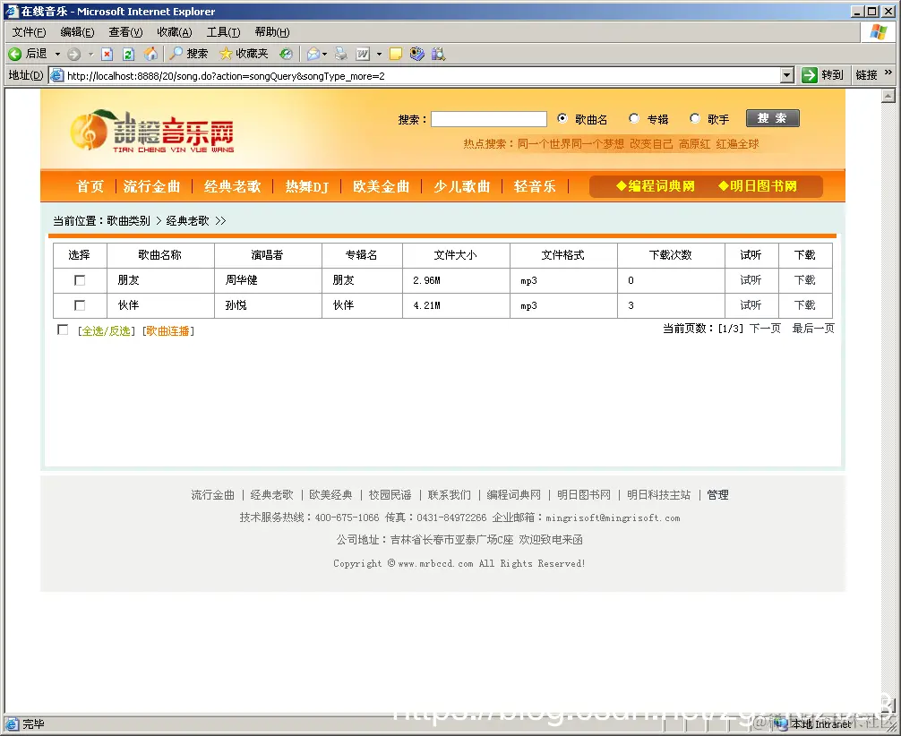 单击页面上方的导航按钮,可按类别对歌曲进行查看,如图1.4所示。在这里可以试听及下载歌曲,下载歌曲前,需要将com\action包下的SongAction.java文件localhost:8080/onlineMusic/改为自己程序的地址。