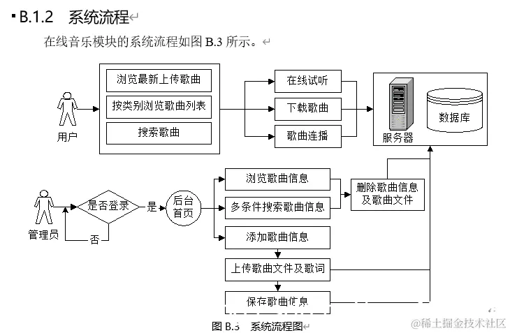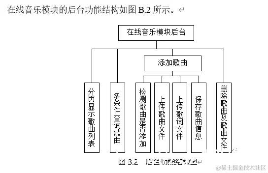 在线音乐模块可以分为前台和后台两个部分。其中,前台主要用于提供歌曲显示、上线试听、歌曲搜索、歌曲下载等功能;后台主要用于对网站中的信息进行管理,重点是添加歌曲和删除歌曲。