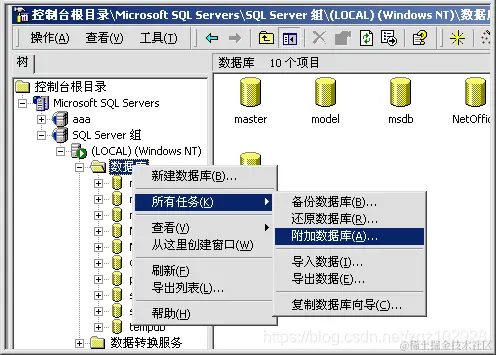 (1)打开SQL Server 2000中的“企业管理器”,然后展开本地服务器,在“数据库”节点上单击鼠标右键,在弹出的快捷菜单中选择“所有任务”/“附加数据库”菜单项,如图1.1所示。