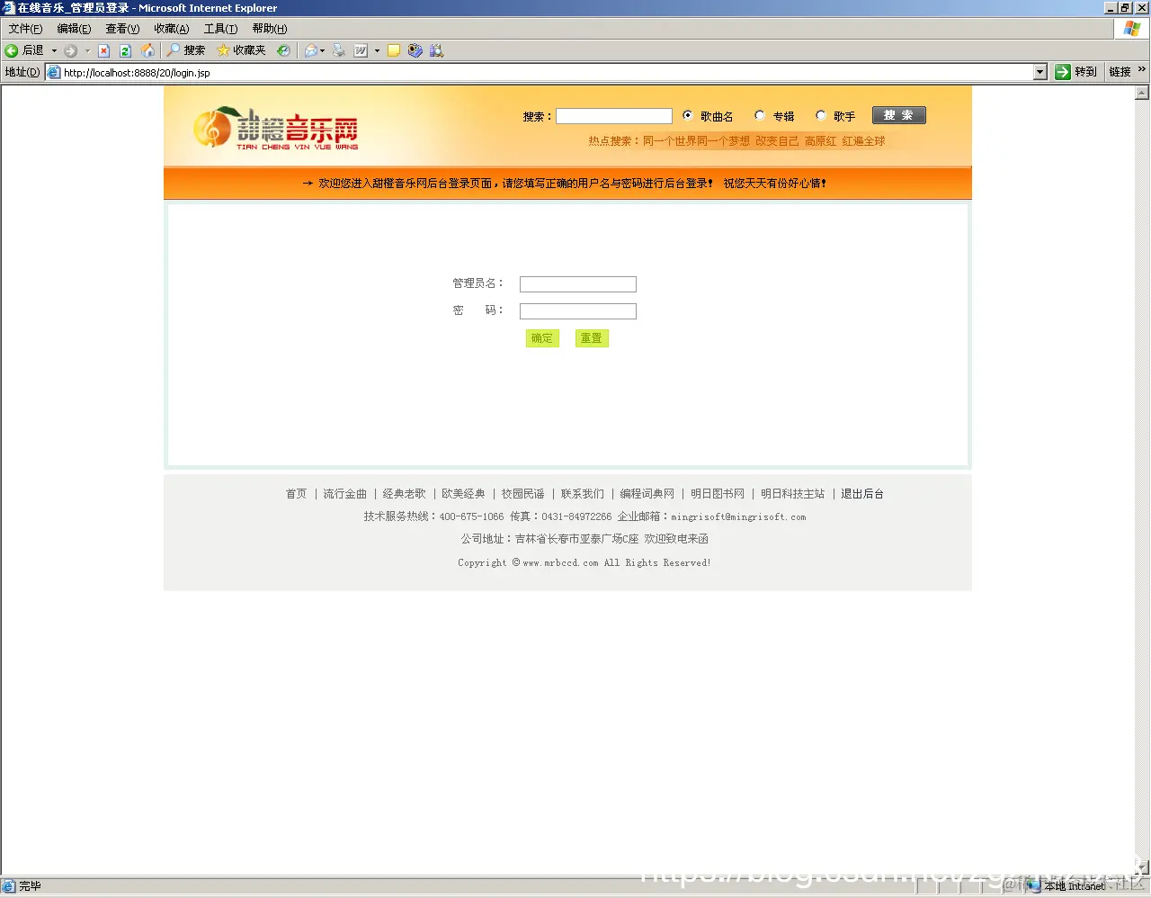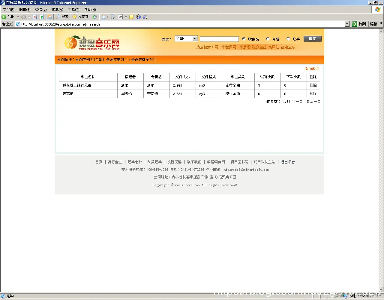 输入用户名mr,密码mrsoft,单击“确定”按钮,进入后台主页面,如图1.6所示。在这里可以添加、删除及查询歌曲记录。