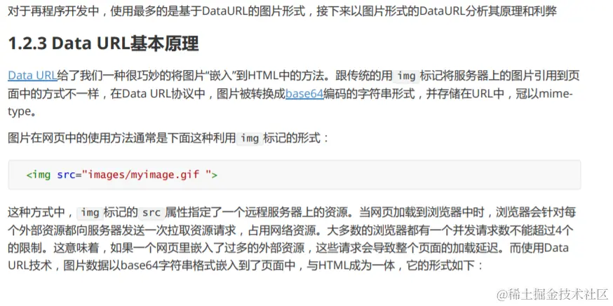 1.2.1 DataURL概述 所谓DataURL是指"data"类型的Url格式,是在RFC2397中提出的,目的是对于一些“小”的数据,可以在网页中直接 嵌入,而不是从外部文件载入。 1.2.2 Data URL入门 完整的DataURL语法:DataURL= data:mediatype;base64,。 mediatype:表述传递的数据的MIME类型(text/html,image/png,image/jpg) 简单的说,data类型的Url大致有下面几种形式。