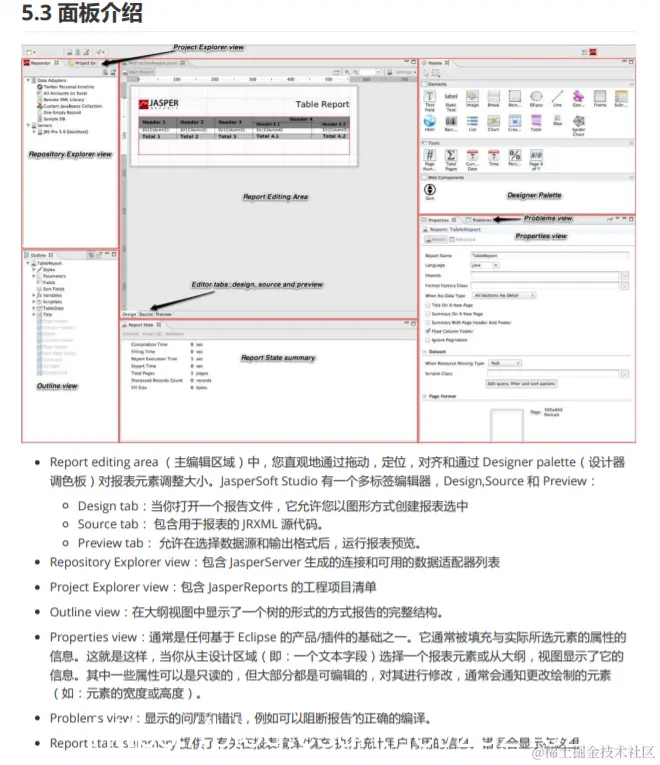 5 模板工具Jaspersoft Studio 5.1 概述 Jaspersoft Studio是JasperReports库和JasperReports服务器的基于Eclipse的报告设计器; 它可以作为Eclipse插件 或作为独立的应用程序使用。Jaspersoft Studio允许您创建包含图表,图像,子报表,交叉表等的复杂布局。您可 以通过JDBC,TableModels,JavaBeans,XML,Hibernate,大数据(如Hive),CSV,XML / A以及自定义来源 等各种来源访问数据,然后将报告发布为PDF,RTF, XML,XLS,CSV,HTML,XHTML,文本,DOCX或 OpenOffice。 Jaspersoft Studio 是一个可视化的报表设计工具,使用该软件可以方便地对报表进行可视化的设计,设计结果为格 式.jrxml 的 XML 文件,并且可以把.jrxml 文件编译成.jasper 格式文件方便 JasperReport 报表引擎解析、显示。