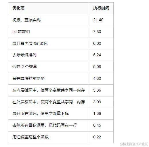 很难只用一个技巧就把性能提升 10 倍,但是可以不断尝试,组合不同技巧,最终实现巨大的性能提升。下面是一个通过不断迭代优化,将执行时间从 21 分 40 秒优化到 22 秒的例子: