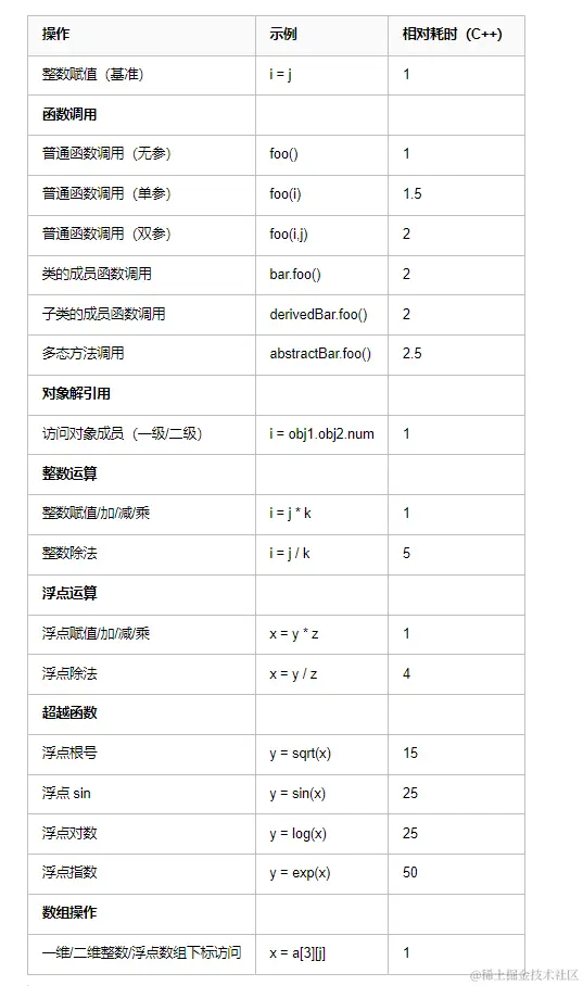 代码调优的方式之一就是用低开销的操作替代高开销操作。一般操作(赋值、函数调用、算数运算)的开销基本相同,除法运算开销较大,超越函数开销尤其巨大,多态函数的调用较普通函数调用有一定额外开销。