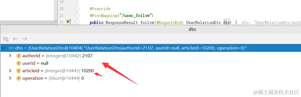 下面是加入关注同样的debug成功获取到前端传来的数据