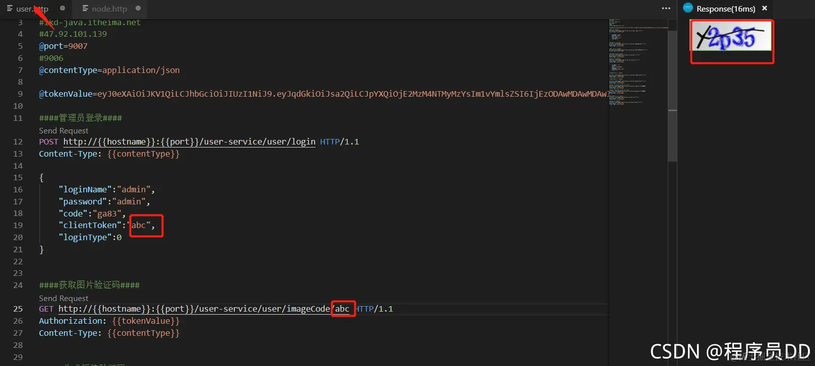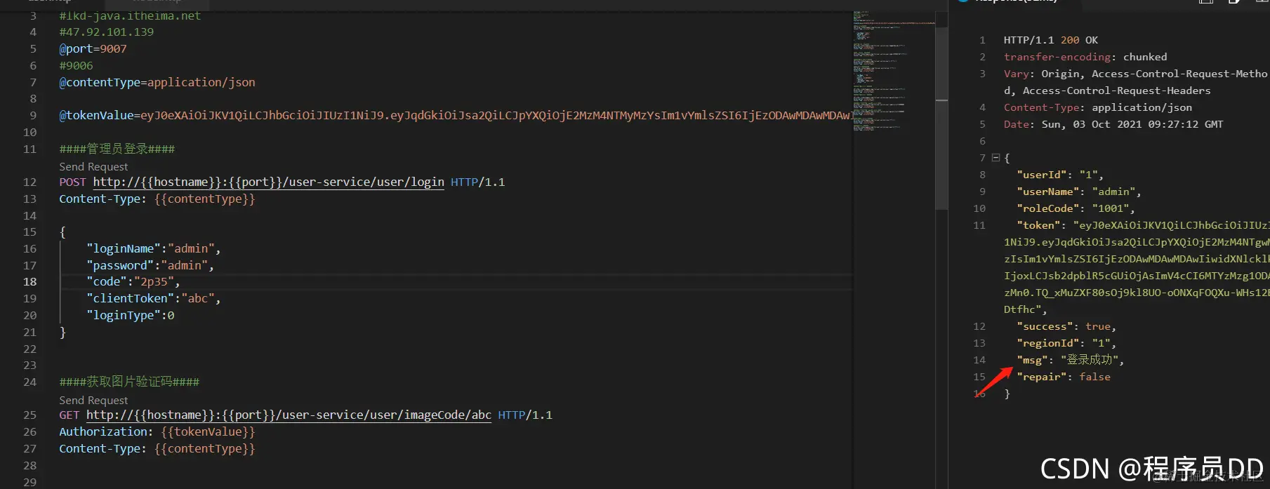 启动完项目加载完对应的工程信息,前端的话需要安装一个VSCODNE 中的RestClinet这个插件这个插件主要是用来测试对应的接口信息的额,比之前用 Swagger 更加方便,更快捷,下面就简单的测试两个接口信息,比如对应的登录操作,登录操作要有对应多的CODE,输入对应的图片验证码就可以登录,登录之后获取对应多的Token信息,检查是否登录成功