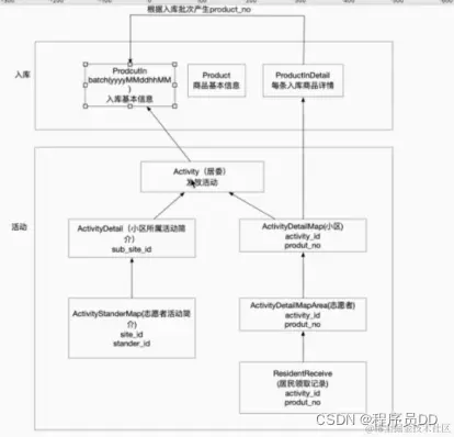 3.居委的动作是分发活动,他的下级是分发给小区(ActivityDetailMap),这个层级关系的架构类似于从同一个居委的活动,可以隶属于不同的小区,小区在往下分发就是志愿者(ActivityDetailMapArea)同一个小区就有不同的志愿者,来进行物资到楼栋的商品信息的转发,这个转发操作其实是分配物资的操作,到居民领取记录(ResidenReceiv)居民领取记录;