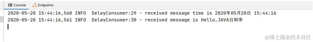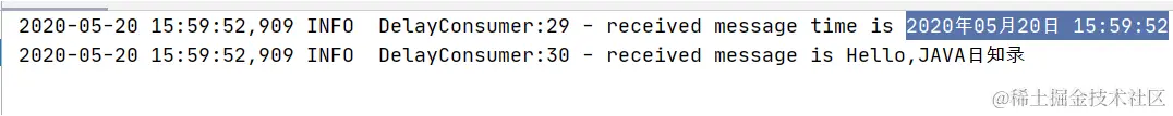 delayProduce.sendDelayMessage("delay-topic","Hello,JAVA日知录",1);