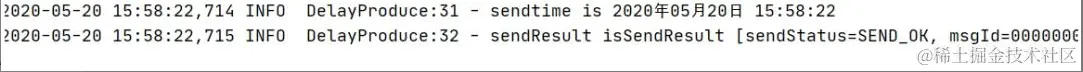 @Component@Slf4jpublic class DelayProduce { @Autowired private RocketMQTemplate rocketMQTemplatet; public void sendDelayMessage(String topic,String message,int delayLevel){ SendResult sendResult = rocketMQTemplatet.syncSend(topic, MessageBuilder.withPayload(message).build(), 2000, delayLevel); log.info("sendtime is {}", DateTimeFormatter.ofPattern("yyyy年MM月dd日 HH:mm:ss").format(LocalDateTime.now())); log.info("sendResult is{}",sendResult); }}