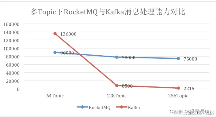那么剩下RocketMQ和Kafka, 这两种队列都是针对大数据设计, 高吞吐性能,特征都比较相似;但是Kafka吞吐性能单机可以达到百万级, 而RocketMQ在十万级 , 是不是就可以采用Kafka? 性能问题解决了, 但是数据的一致性呢? Kafka正因为其高性能,每个Partition一个物理文件, 带来的弊端是不能严格保证顺序, 这样就会导致数据出现错乱, 而金融场景对这点是非常严格苛刻, RocketMQ正是借鉴Kafka架构重新设计, 可以支持上千个Topic而不衰减。