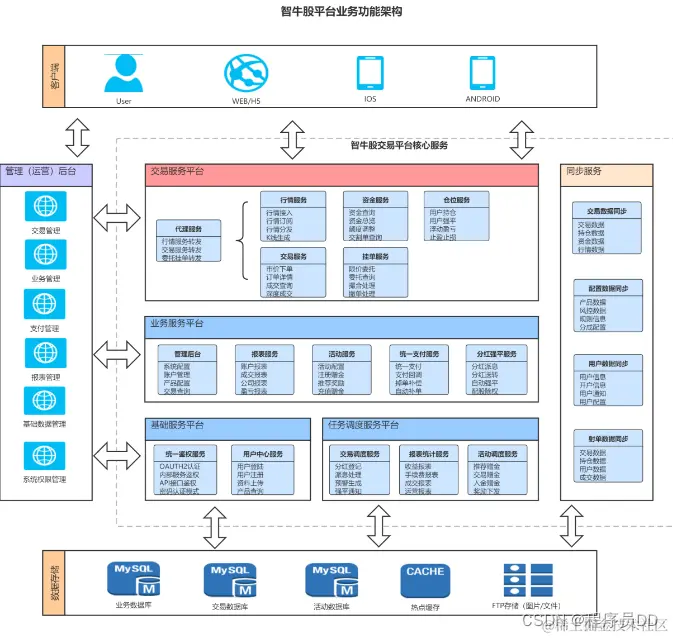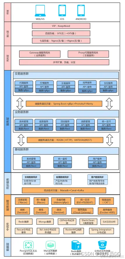 - 数据层服务采用Redis集群作热点缓存, Ceph作分布式文件存储, MongoDB作NoSQL缓存, 支撑海量交易服务。