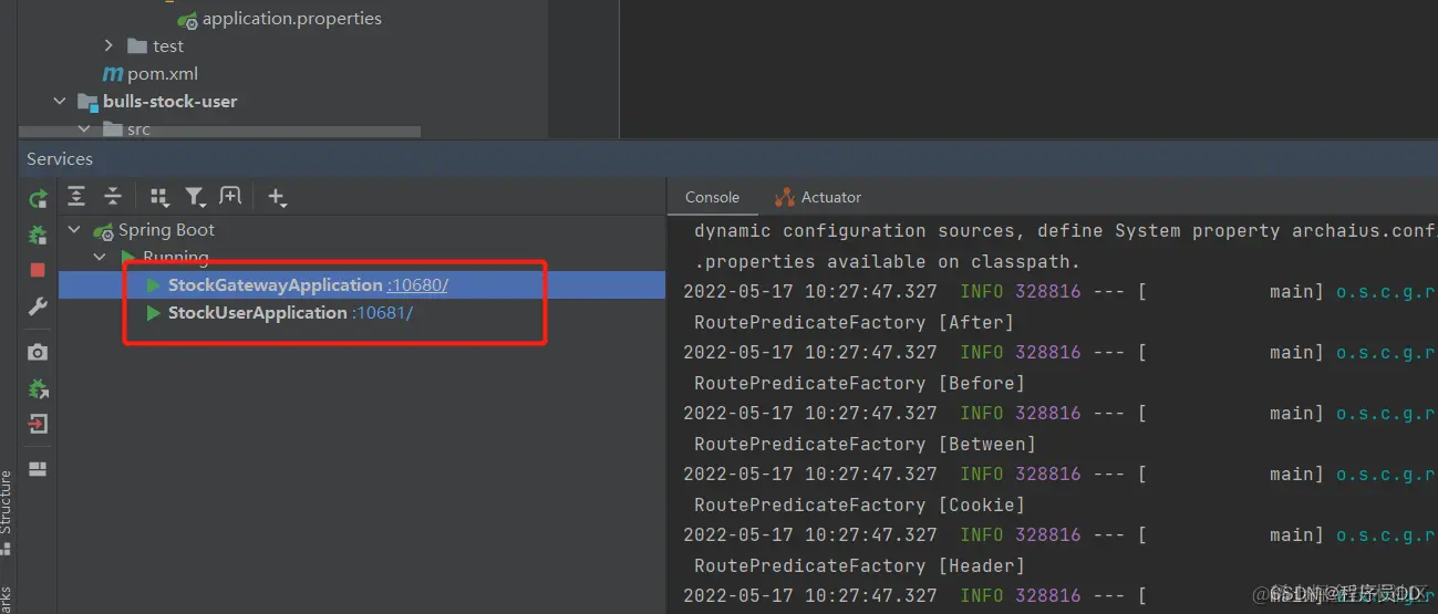 # 服务配置信息 server.port=10681 spring.application.name=stock-user spring.cloud.nacos.discovery.server-addr=127.0.0.1:8848 management.endpoints.web.exposure.include=*StockUserApplication运行主类代码: