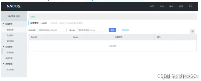 spring.security.enabled=false management.security=false security.basic.enabled=false nacos.security.ignore.urls=/**执行bin目录下的startup.cmd启动, 访问http://127.0.0.1:8848/nacos 正常开到管理后台界面。