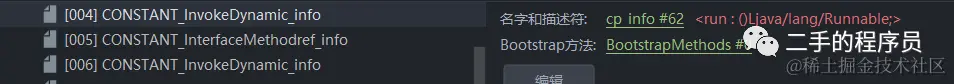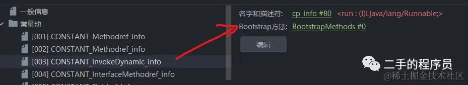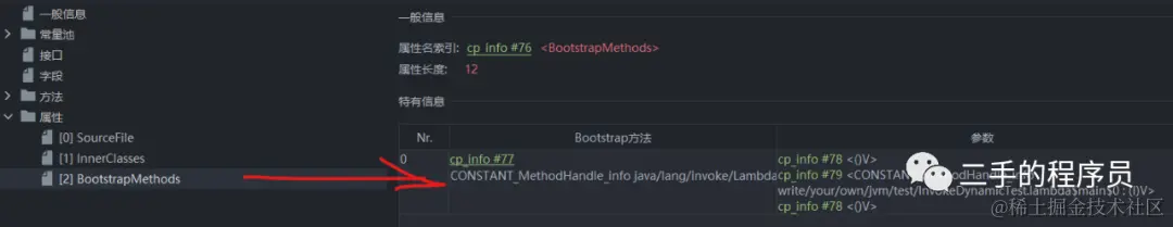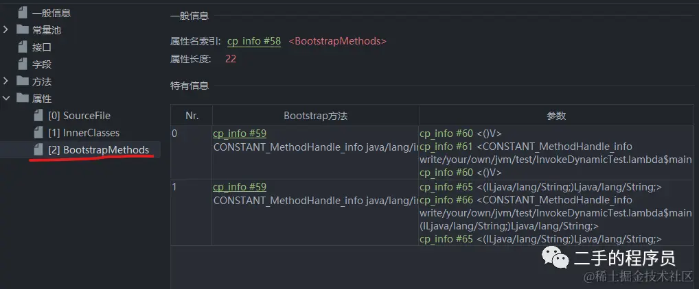 常量池索引指向的是一个 CONSTANT_InvokeDynamic_info 类型的常量。而这个常量里面又指向了 BootstrapMethods的索引: