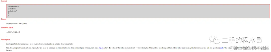 在第8个字节的位置,出现了一个 invokedynamic 指令。我们看一下官方文档: