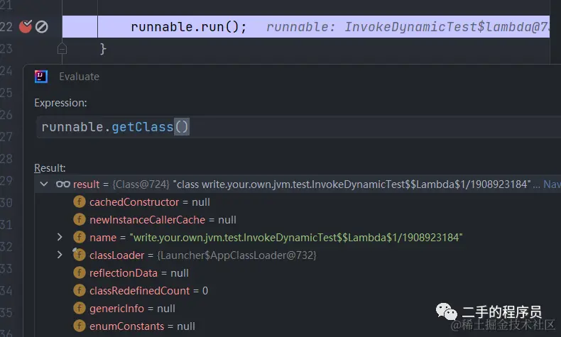 看到这个类,我们就知道,invokedynamic 指令会返回这个InvokeDynamicTest$$Lambda$1对象,然后 invokeinterface 也是执行的这个对象的方法。打断点发现我们的猜测是对的: