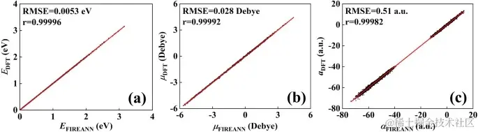 FIREANN 和 DFT 对 NMA 的能量 (a)、偶极矩 (b) 和极化率 (c) 的预测相关性图