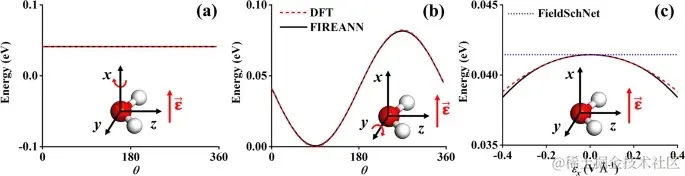 由于外场和分子平面始终正交,分子的势能不会发生变化。FIREANN 准确预测到了这一结果。