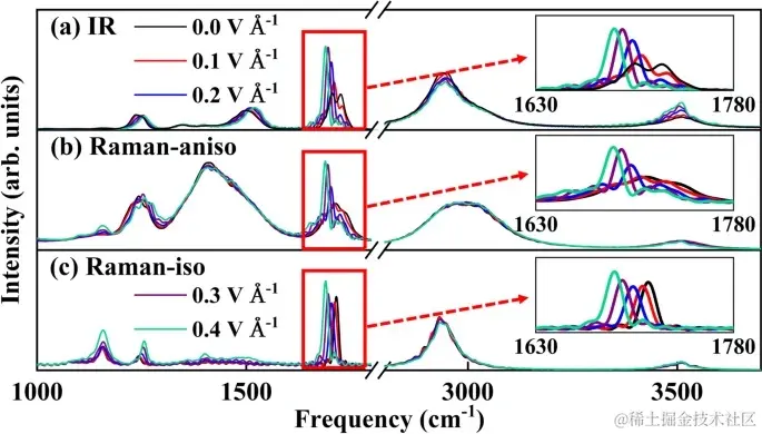 此外,FIREANN 还预测,外加电场会降低化学键的强度,导致 CO 的拉伸振动红移,距离与电场强度成正比。